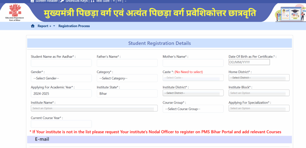• क्लिक करने के बाद विद्यार्थी रजिस्ट्रेशन फॉर्म में मांगी गई जानकारी को दर्ज करें