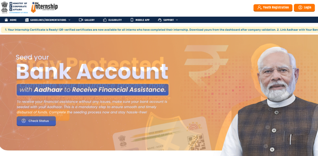 - सबसे पहले आप प्रधानमंत्री इंटर्नशिप योजना के ऑफिसियल वेबसाइट pminternship.mca.gov.in के होम पेज पर जाएं