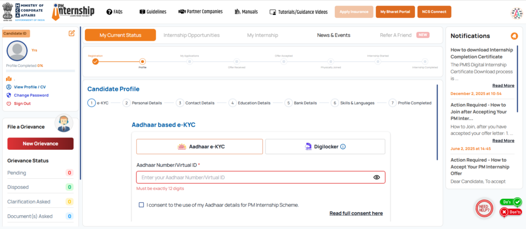 जब आप पोर्टल के अंदर रजिस्ट्रेशन की प्रक्रिया कंप्लीट कर लेते हैं तो कुछ नए स्टेप को फॉलो करना है प्रधानमंत्री इंटर्नशिप योजना ऑनलाइन आवेदन करने के लिए जैसा कि आप नीचे फोटो में देख पा रहे हैं